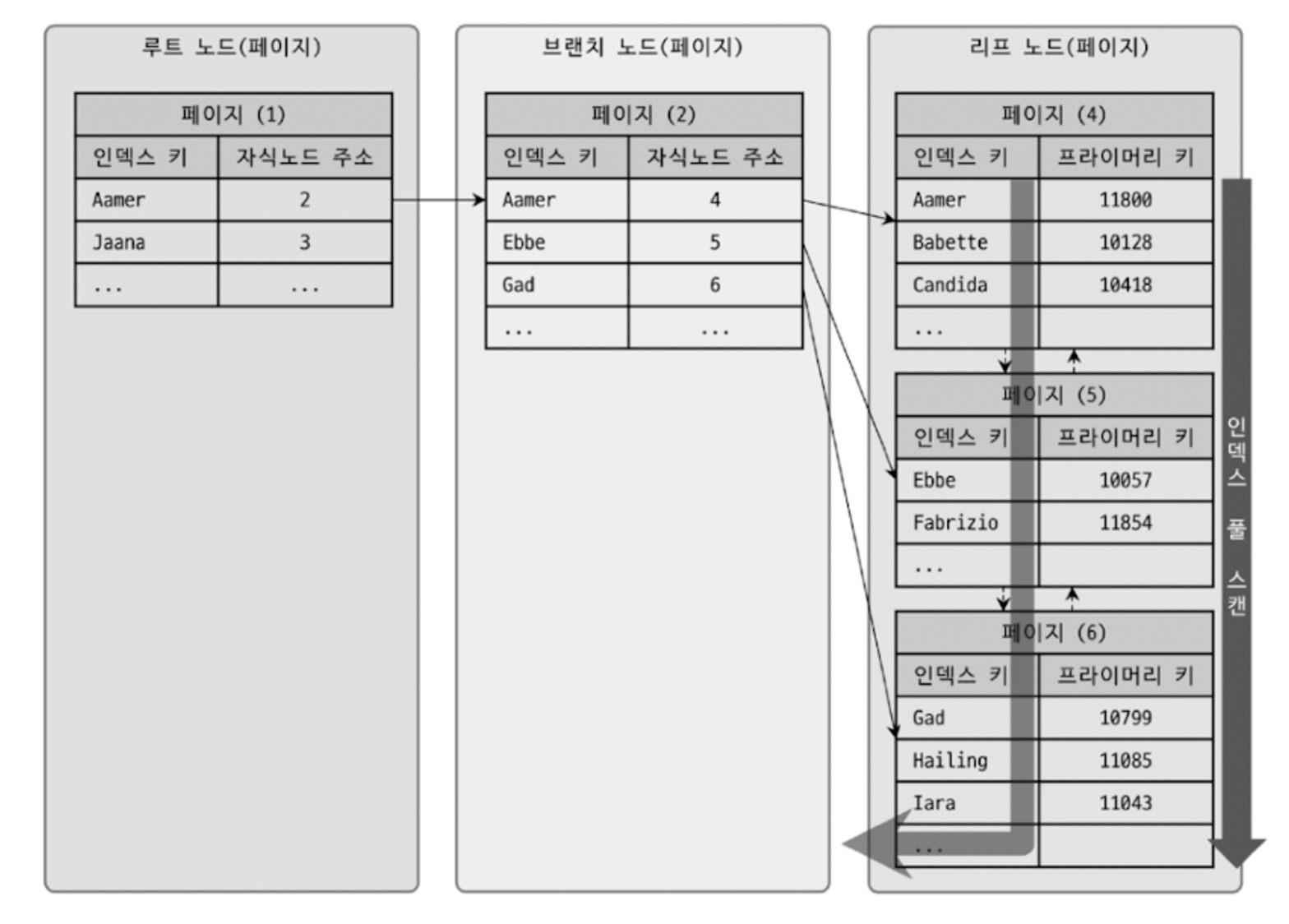(만약 하나의 리프 노드를 끝까지 읽으면, 리프 노드 간 링크를 이용해 다음 리프노드를 스캔한다)