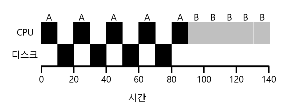 예시를 들어보자. 50msec의 CPU시간을 필요로하는 작업 A,B가 있고, 작업 A는 10msec마다 10msec의 입출력 요청을 한다.