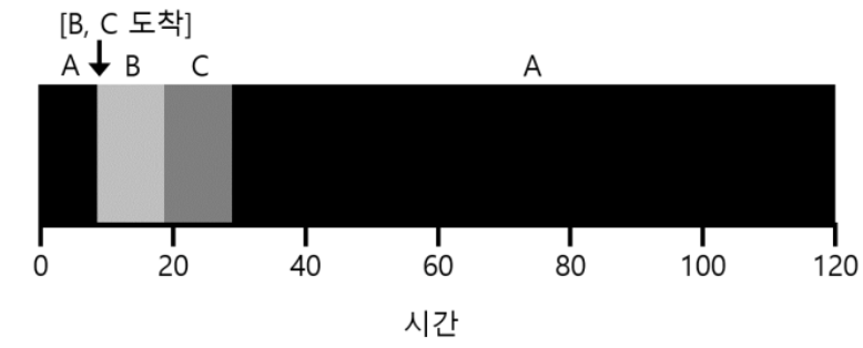 이역시 A가 실행중일 때 B와 C가 도착한다면 FIFO 스케줄링과 동일한 문제가 발생할 것이다.
